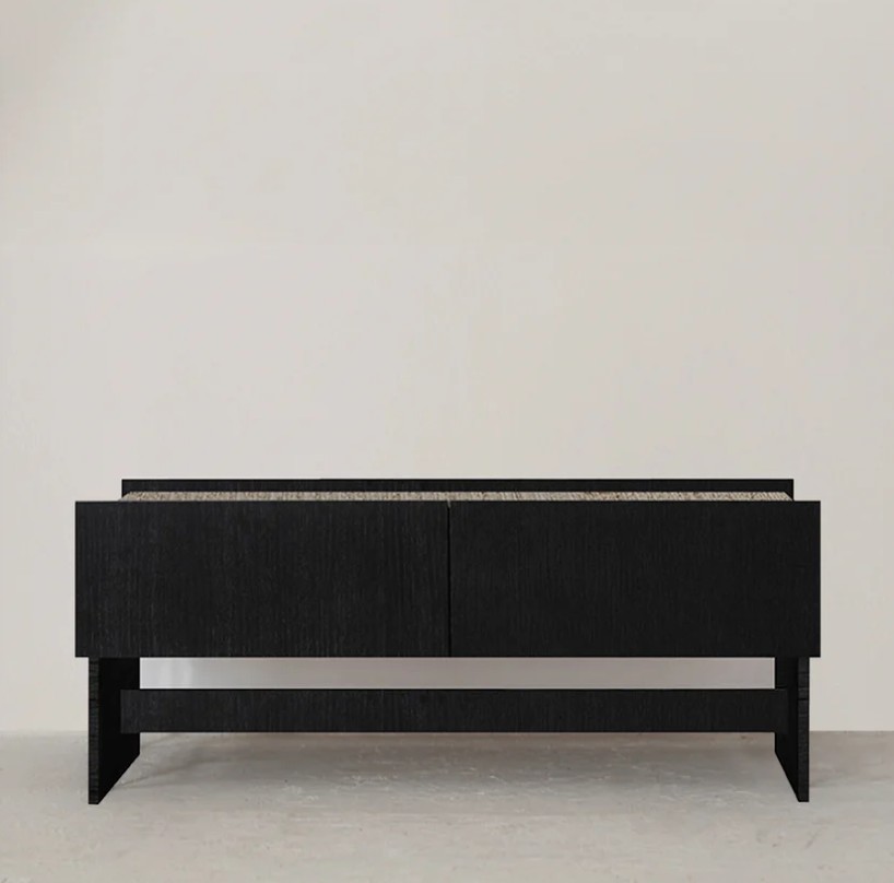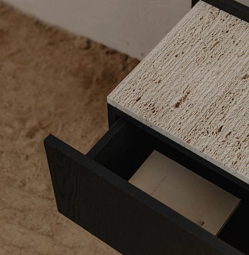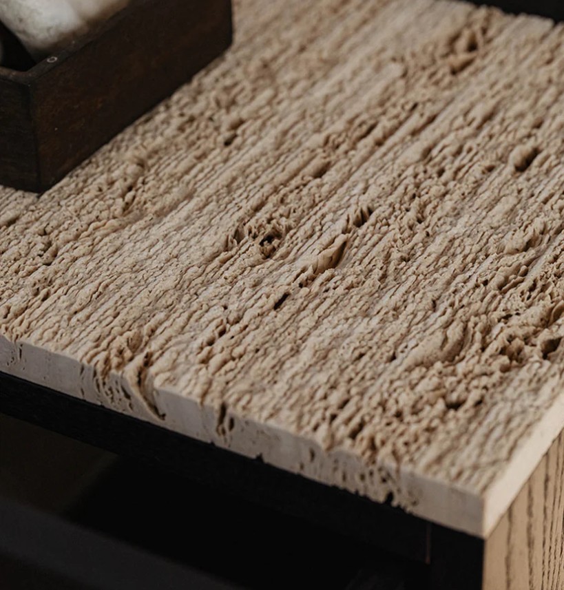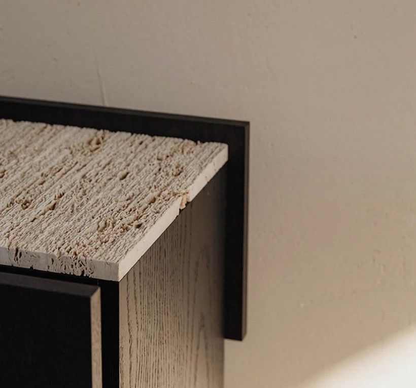 Sercem komody BOVA jest blat z naturalnego kamienia, który nadaje całości wyjątkowego charakteru. Do wyboru pozostaje prążkowany trawertyn LINEE, zachwycający rytmem naturalnych żył, lub elegancki kwarcyt Taj Mahal o subtelnym, satynowym wykończeniu. Każdy z tych materiałów podkreśla luksusowy, a zarazem powściągliwy charakter mebla i sprawia, że każdy egzemplarz jest niepowtarzalny.