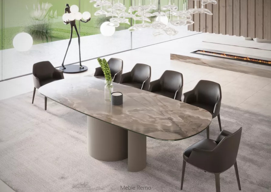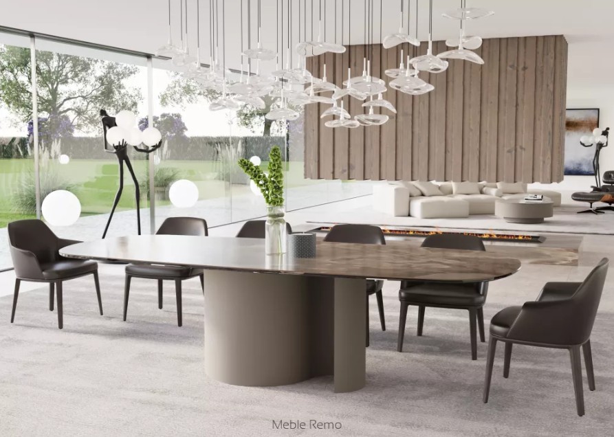 Stół ESSO marki REMO MEBLE to nowoczesna forma luksusu, w której technologia spotyka się z wyrafinowaną estetyką. Jego lekka wizualnie konstrukcja i dopracowane proporcje sprawiają, że staje się centralnym elementem wnętrza, przyciągając uwagę subtelną elegancją.