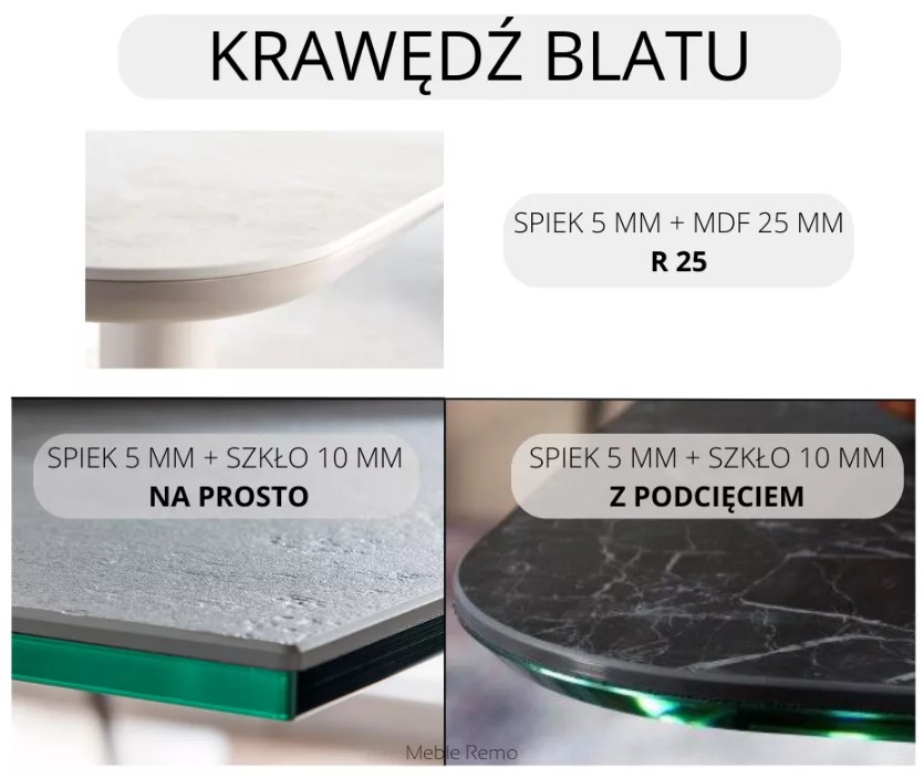Istnieje możliwość wykonania mebla w innym rodzaju spieku oraz w dowolnym rozmiarze, zarówno w wersji rozkładanej, jak i nierozkładanej. Dzięki szerokiemu wyborowi wykończeń i konfiguracji stoły można dopasować do indywidualnych potrzeb oraz charakteru wnętrza.
