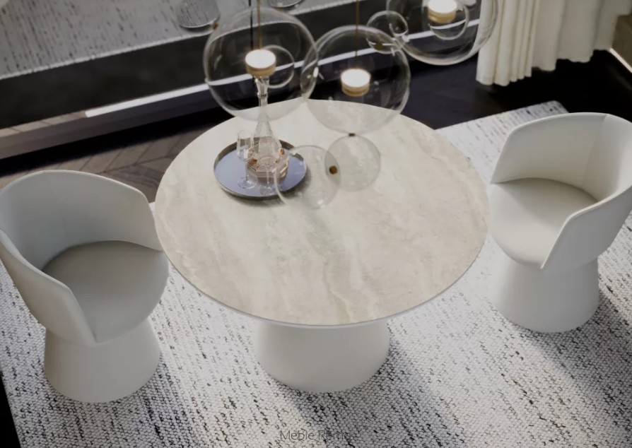 Konstrukcja blatu oparta na płycie MDF lub szkle zapewnia stabilność i estetyczne wykończenie detali, a podcięte krawędzie nadają mu lekkości wizualnej. Okrągła forma sprzyja interakcji i tworzy przyjazną przestrzeń do spotkań.