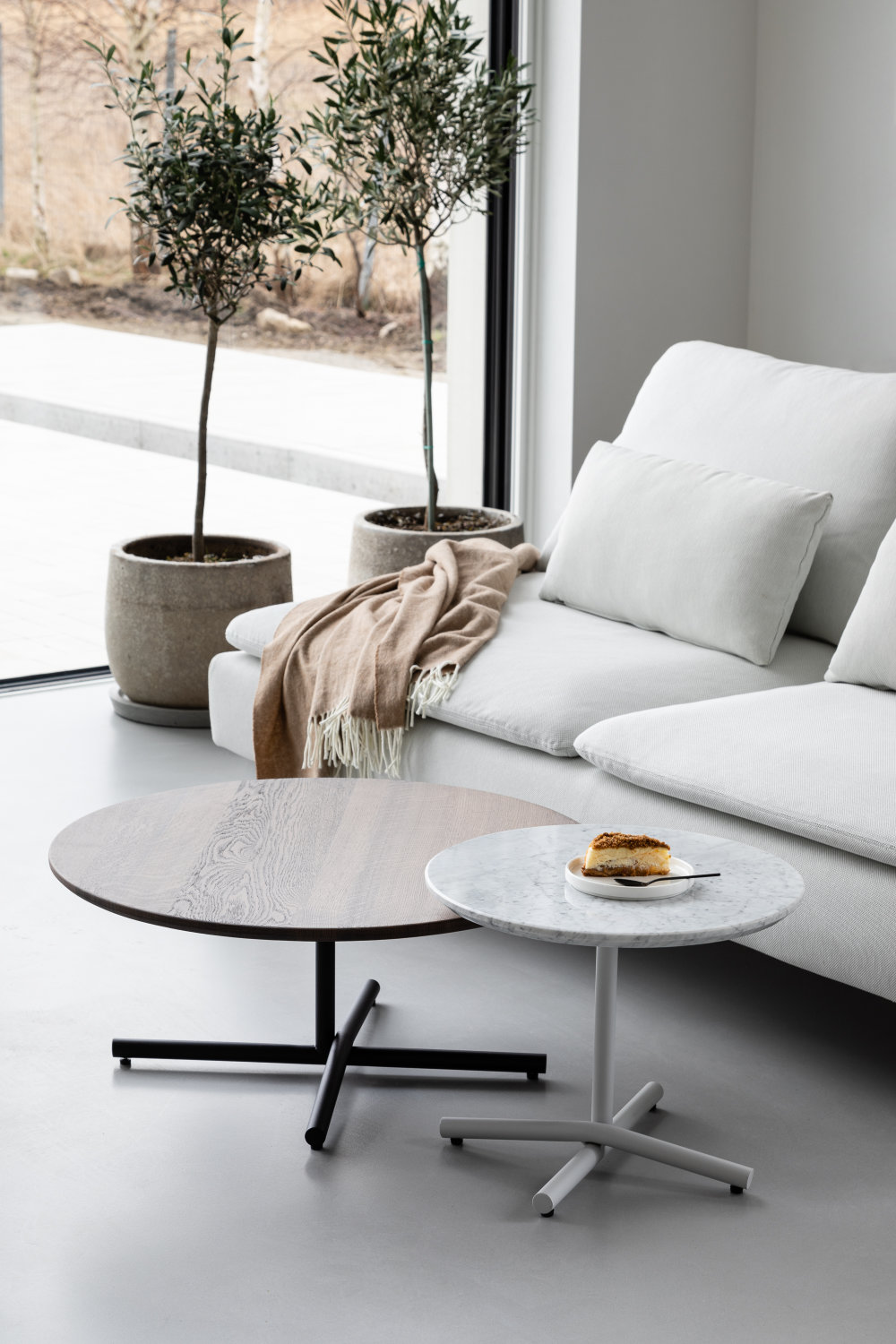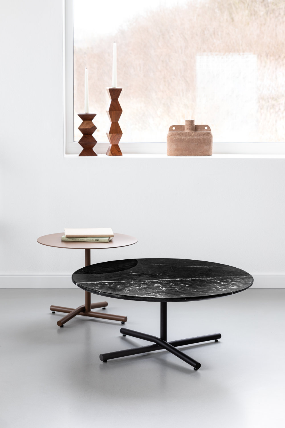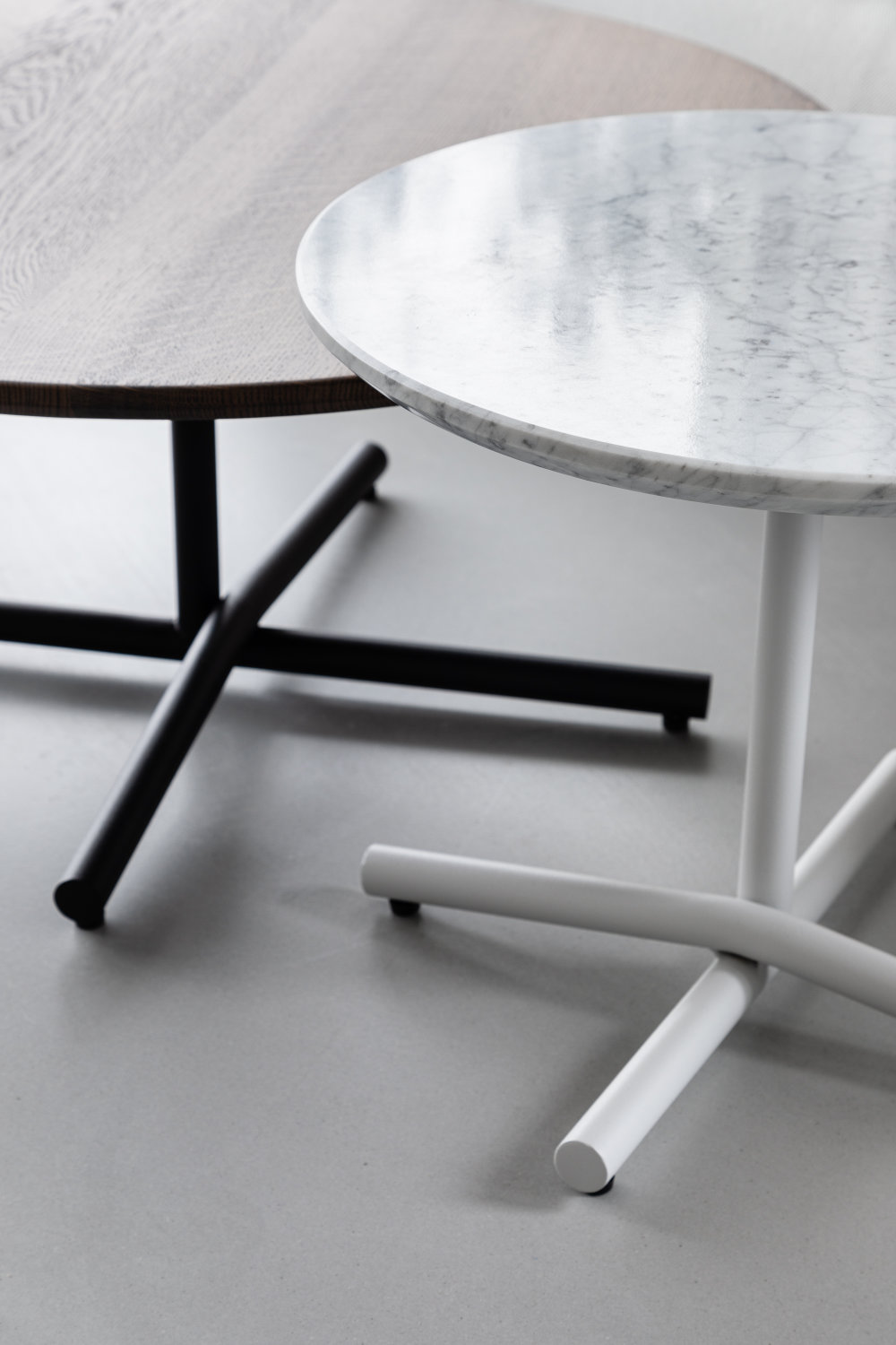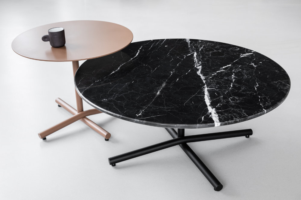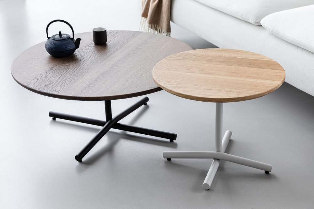 W wersji niskiej stoliki są bardzo rozłożyste – dominuje w nich pięknie wykończona powierzchnia. Olśniewające krzyżowanie się stalowych rur sprawia, że stolik robi piorunujące wrażenie i pomimo swojej niewielkiej konstrukcji jest bardzo stabilny. Stół ma bogatą kolorystykę RAL, dobraną tak, aby idealnie pasowała do wystroju wnętrza, bez dodatkowych kosztów. Możliwość wykończenia blatu dwoma materiałami: lity dąb i naturalny marmur sprawiają, że stolik można dostosować bardzo indywidualnie.