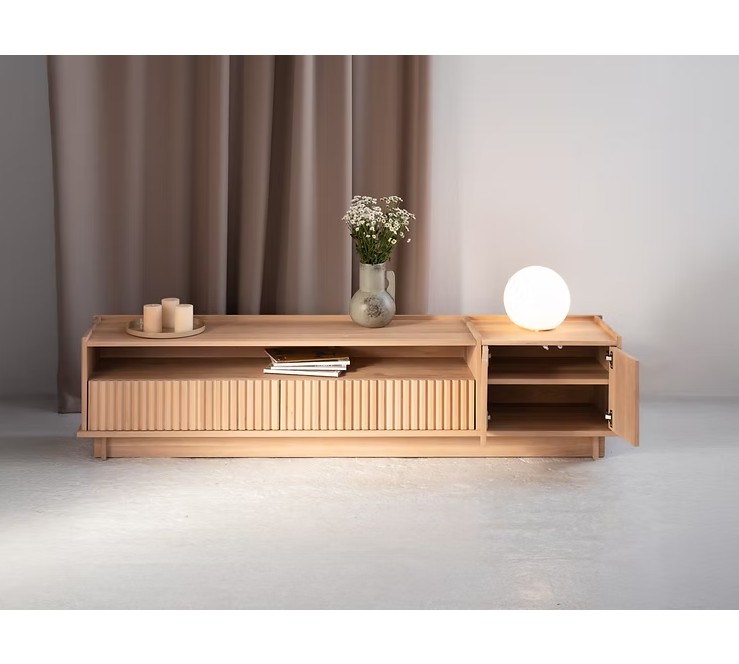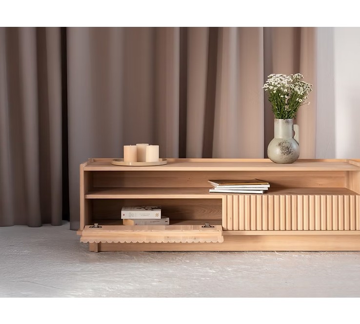 Szafka RTV TANA to hołd dla stylu japandi – harmonijnego połączenia japońskiego minimalizmu i skandynawskiej funkcjonalności. Jej konstrukcja opiera się na klasycznych stolarskich wpustach, co podkreśla rzemieślniczy charakter i trwałość mebla. Każdy detal został zaprojektowany z myślą o prostocie, równowadze i naturalnym pięknie.